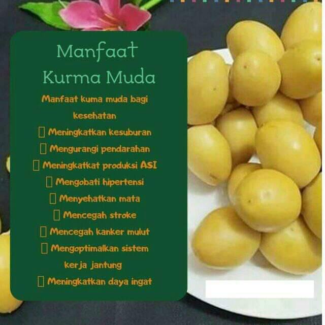Khasiat buah kurma yang masih muda. Manfaat Kurma muda yang utama yaitu untuk promil atau untuk meningkatkan kesuburan pada pria maupun wanita namun sebenarnya manfaat kurma muda tidak hanya untuk kesuburan saja karena kurma muda juga bermanfaat bagi kesehatan tubuh bermanfaat untuk memperlancar ASI ibu hamil memperlancar proses persalinan dan bagus untuk kesehatan mata. Banyak sekali jenis kurma yang berkhasiat dalam menjaga kesehatan pria dan wanita salah satunya adalah buah kurma muda segar atau buah kurma yang masih. Kurma yang masih muda juga bisa menjadi alternatif bagi ibu menyusui yang mengalami kesulitan mendapatkan daun katuk.